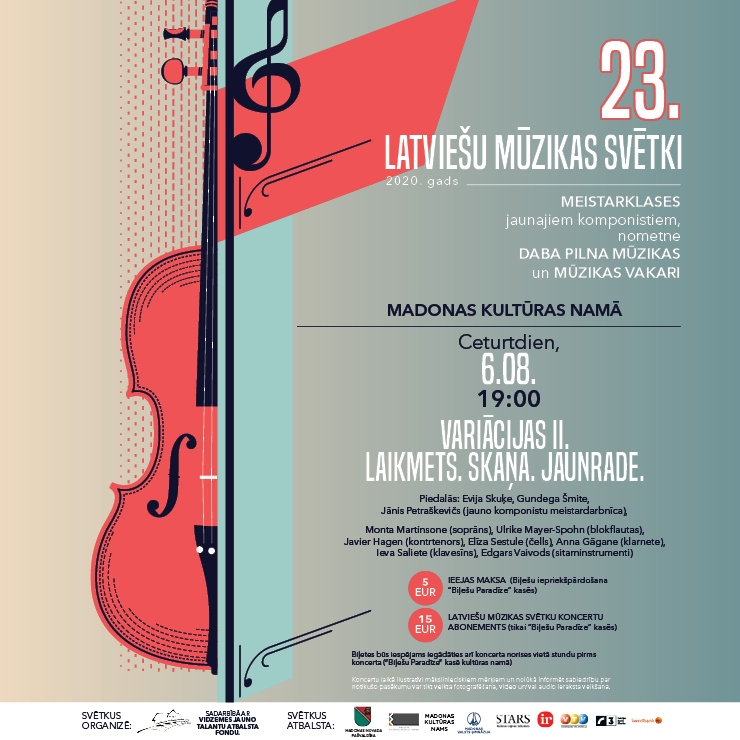 23.Latviešu mūzikas svētki. Laikmets. Skaņa. Jaunrade. Jauno komponistu veikums Evijas Skuķes, Gundegas Šmites un Jāņa Petraškēvica vadībā. Izpilda soprāns Monta Martinsone, blokflautiste Ieva Nīmane, kontrtenors Mikus Abaroniņš, čelliste Elīza Sestule, klarnetiste Anna Gāgane, klavesīniste Ieva Saliete un sitaminstrumentālists Edgars Vaivods