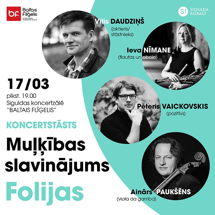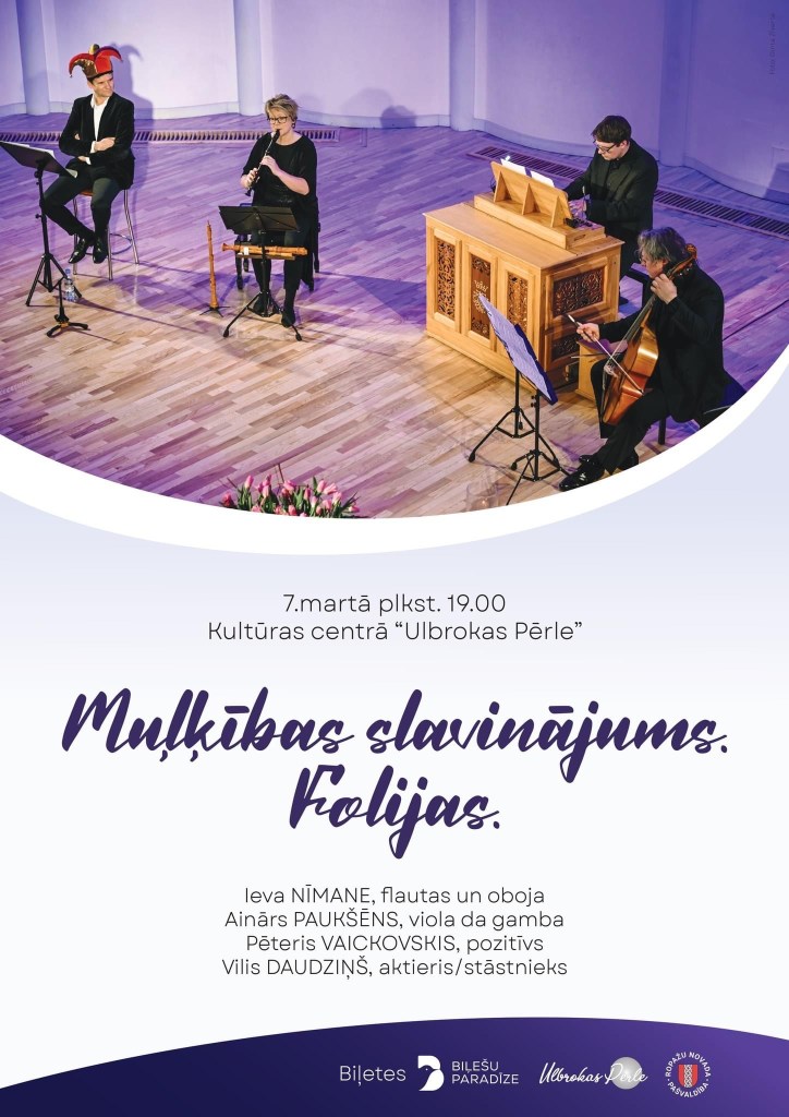 MUĻĶĪBAS SLAVINĀJUMS. LA FOLIA Readings from Praise of Folly by Desiderius Erasmus form Rotterdam, La Folia from 16th and 17th century by Marin Marais, Arcangelo Corelli, Benedetto Marcello etc.