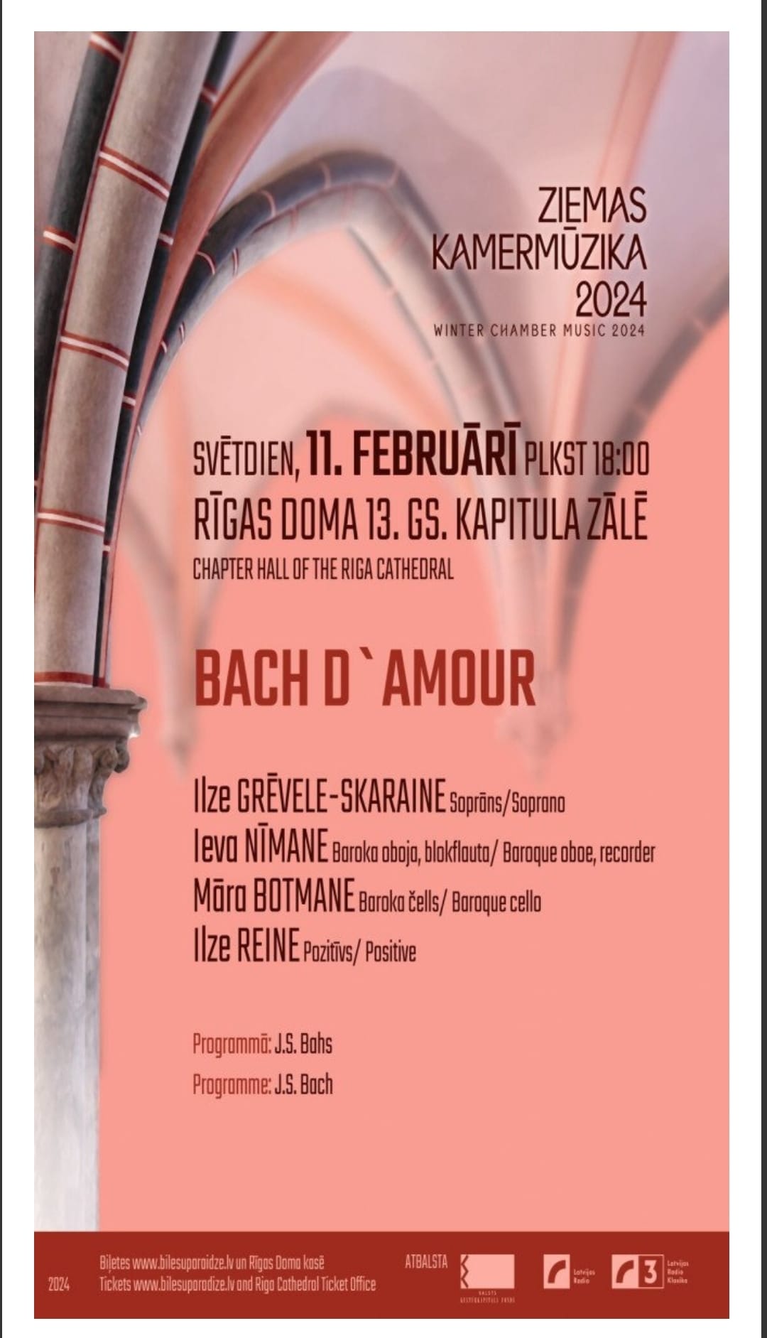 Ieva Nimane (oboe, oboe d’amour), Ilze Grēvele (soprano), Maija Kļaviņa (traverso) Laura Šarova, Anna Naudžūne (violin), Guna Jegorova (viola), Ainārs Paukšēns (violoncello, viola da gamba), Gerda Jerjomenko (harpsichord). Introduction by Zane Prēdele. Music by J.S.Bach, P.D.Philidor and J.C.Bach.